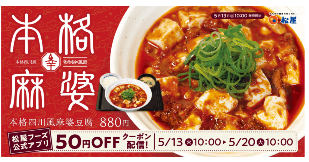 松屋フーズが運営する牛丼チェーン「松屋」は8日、新メニュー「本格四川風麻婆豆腐」を5月13 日から発売すると発表しました。価格は880円です。