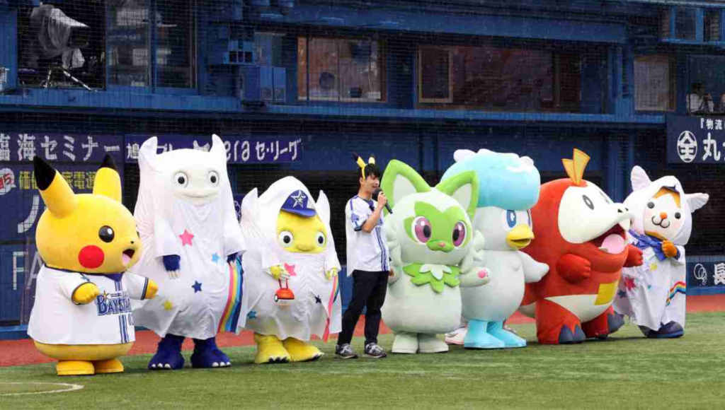 プロ野球 DeNA対中日 「ポケモンボールパーク ヨコハマ」として行われるDeNA対中日戦 グラウンドに姿を見せたピカチュウ(左)らボケモンたちとDeNAのマスコットたち=2023年6月30日、横浜スタジアム(撮影・荒木孝雄)