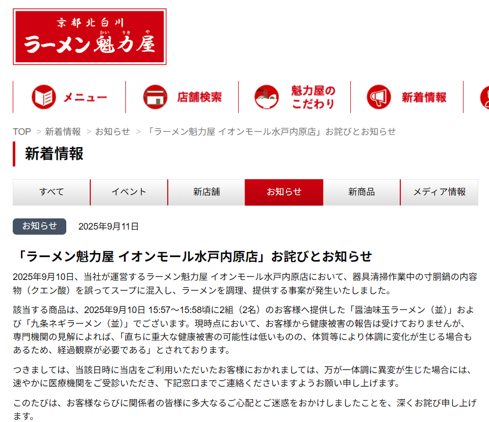 ラーメンチェーン「魁力屋(かいりきや)」(京都市)は11日、イオンモール水戸内原店(水戸市)で、クエン酸を誤ってスープに混入したラーメンを2食提供したと発表しました。謝罪した上で再発防止を強化する方針を明らかにしています。現時点で健康被害は報告されていません。