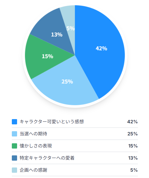 今回の分析では、全体としてこのキャンペーンに関する肯定的な反応が大半を占めていました。特にリラックマ、すみっコぐらしのキャンペーンに歓喜する声が多い中、たれぱんだやアフロ犬、こげパンなどいわゆる「平成女児」世代に人気だったキャラクターがラインアップされており、懐かしさを感じる声もありました。