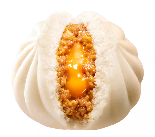 「開けてびっくり!こってり!がっつり!」がキャッチコピーの本商品は、とろとろの卵黄風ソースが入っており、背脂ニンニクがしっかりと効いた肉まんです。刻みニンニクと豚肉・背脂の食感も楽しめる一品としています。
