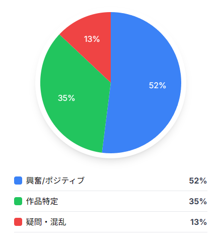 今回の分析では、今回、投稿された写真に対し、多くの人が興奮やポジティブな反応を示しており、人気漫画とのコラボを期待する声が多く見られます。具体的には「カグラバチ」という作品との関連性を指摘する声が多く、一部は「渋谷金魚」という別の作品を連想していました。ほかにも「結界師」「血潜り林檎と金魚鉢男」などの作品名も挙げられています。一部のユーザーは「金魚パティ」などの新メニューを連想していたほか、ビジュアル的な「墨絵風の金魚」のデザインを評価するコメントもありました。