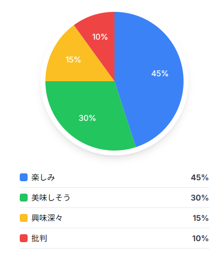 今回の分析では、東洋水産が、カップ入り即席麺「マルちゃん 赤い天ぷらそば」「同 緑の天ぷらうどん」を13日から全国で新発売するという話題に対し、登場を喜ぶ声のほか、期待するコメントが大部分を占めました。「赤い」が「そば」で「緑の」が「うどん」という色と種類の組み合わせに対して驚きや戸惑いを示すコメントも多く見られます。このほか、紅生姜天ぷらやあおさ天ぷらの味への期待や過去の食体験の共有、両方購入して天ぷらを入れ替えるという「裏ワザ」の提案などもありました。