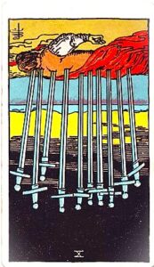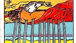 10本ものソードが、全身に刺さって倒れている姿を描いたカード。