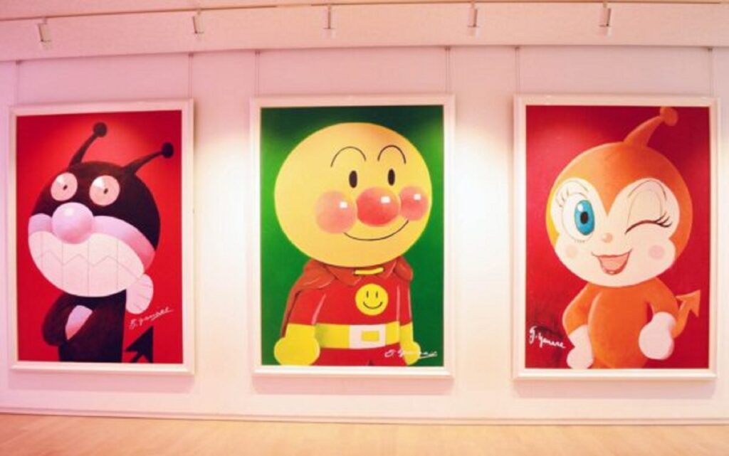 展示されたアンパンマン(中央)、ばいきんまん(左)、ドキンちゃんの絵=高知県香美市香北町の「香美市立やなせたかし記念館アンパンマンミュージアム」