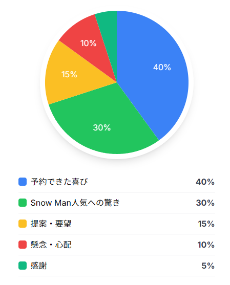 今回の分析では、不二家が1日に予約を開始した人気アイドルグループSnow Manとコラボしたクリスマスケーキ「Smile Switchクリスマス」の店頭予約販売をわずか6日間で終了するという話題に対し、多くの人がSnow Man人気の高さを実感していたほか、実際に予約できた喜びや商品の可愛さを称賛するコメントが目立ちます。一部には転売への懸念や、受注生産での対応を望む声も見られます。また、予約時の店員の対応に感謝する声や、今後のグッズ展開を希望する意見もありました。