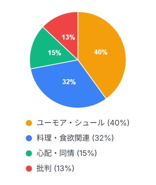 今回の分析では、ひよこちゃんがホイル焼きにされている画像投稿に対し、SNSでは「シュールすぎる」「グロかわいい」といったユーモア混じりの反応が多く見られました。「いい出汁が出そう」「バターを忘れてる」など料理として楽しむコメントが多く、一方で「焦げちゃうよ」「早く逃げて」と心配する声や、「食べ物で遊ぶな」と批判する意見も一部に見られました。全体としては、ブラックジョーク的な可笑しさを楽しむ前向きな反応が中心でした。