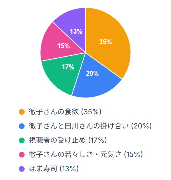 今回の分析では、視聴者からは徹子さんの若々しさ、旺盛な食欲、楽しそうに食べる姿に対する驚きと称賛のコメントが多く寄せられています。特に、90歳代とは思えない食べっぷりに驚く声が多く、「徹子さんが美味しそうに食べる姿を見ると元気をもらえる」「食べることが長生きの秘訣」というコメントが目立ちます。このほか徹子さんの純粋な反応や、高速レーンに驚く様子、田川さんとの掛け合いを楽しむ視聴者も多いようです。