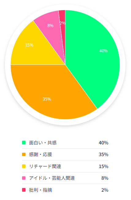 今回の分析では、大多数の視聴者がこの企画を心待ちにしており、粗品さんがさまざまなニュースについて冷静かつ的確なコメントをしていることに好評の声が多く上がっていることが分かりました。特にAぇ! groupリチャードさんの件はやさしく適切に扱っていると評価されています。また忙しいスケジュールにも関わらず動画を続けていることへの感謝の声が多く見られます。
