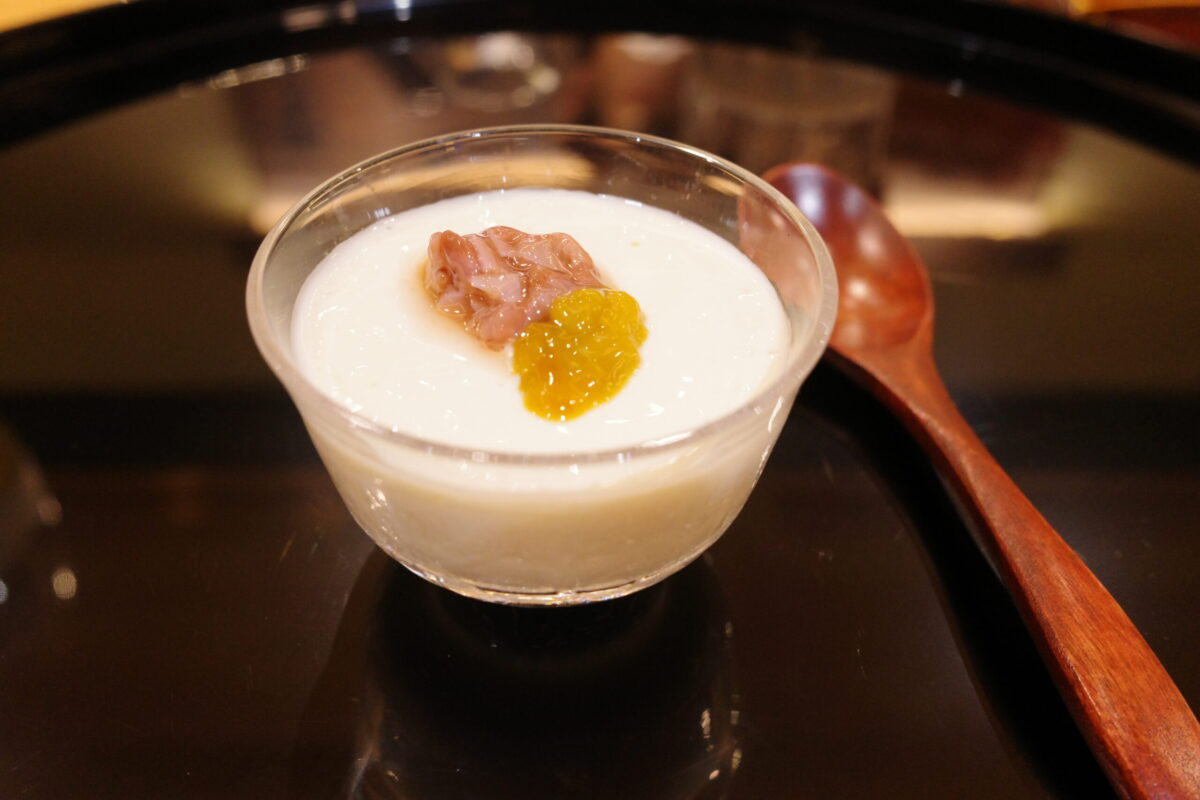 続く「前菜4種」は、見た目も味も楽しいラインナップ。豆腐のスープ仕立てに塩辛や雲丹をのせた一品は、濃厚なのにまろやか。