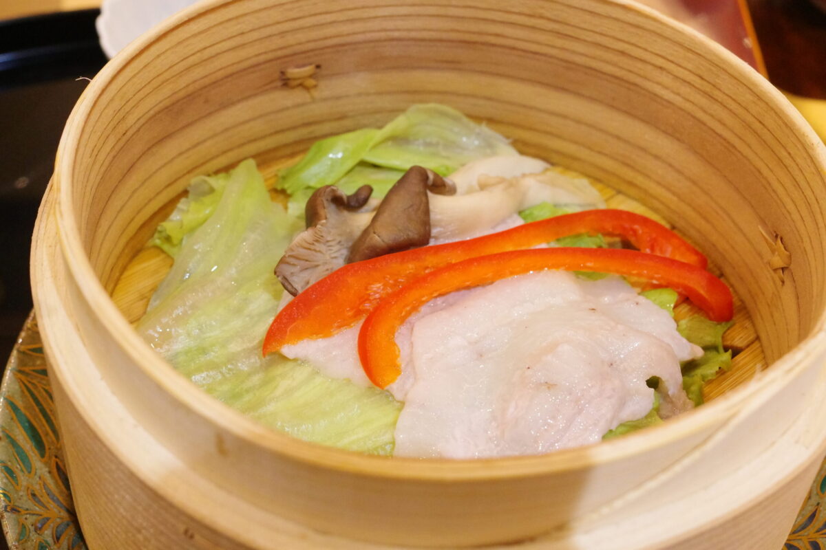 「季節のお野菜の蒸篭蒸し」は、蒸すことで野菜の甘みがぎゅっと凝縮され、塩だけで十分なおいしさです。