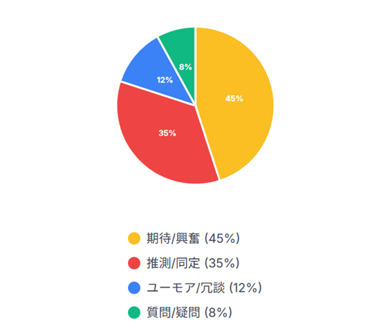 今回の分析では、バーミヤンの麻辣湯のPR投稿に対し、SNSではコラボ相手の正体に注目が集まりました。多くのユーザーがシルエットからVチューバー「四季凪アキラ(にじさんじ)」と推測しており、「アキラだ!」「コラボ楽しみ!」といった期待の声が多数寄せられています。中には「葛葉の新衣装では?」などの冗談交じりのコメントも見られ、全体的に楽しみながら予想を交わす前向きで盛り上がった反応が中心でした。