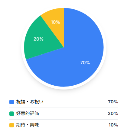 今回の分析では、村上さんが一般女性との結婚を発表したことに対し、多くのお祝いの声が寄せられました。「おめでとう」という直接的な祝福の言葉が多く、長年の芸能活動を経た上での結婚を喜ぶ声が目立ちました。村上さんの誠実な人柄や仲間やファンへの感謝の気持ちを表した結婚発表文に対する好意的な反応も寄せられていました。