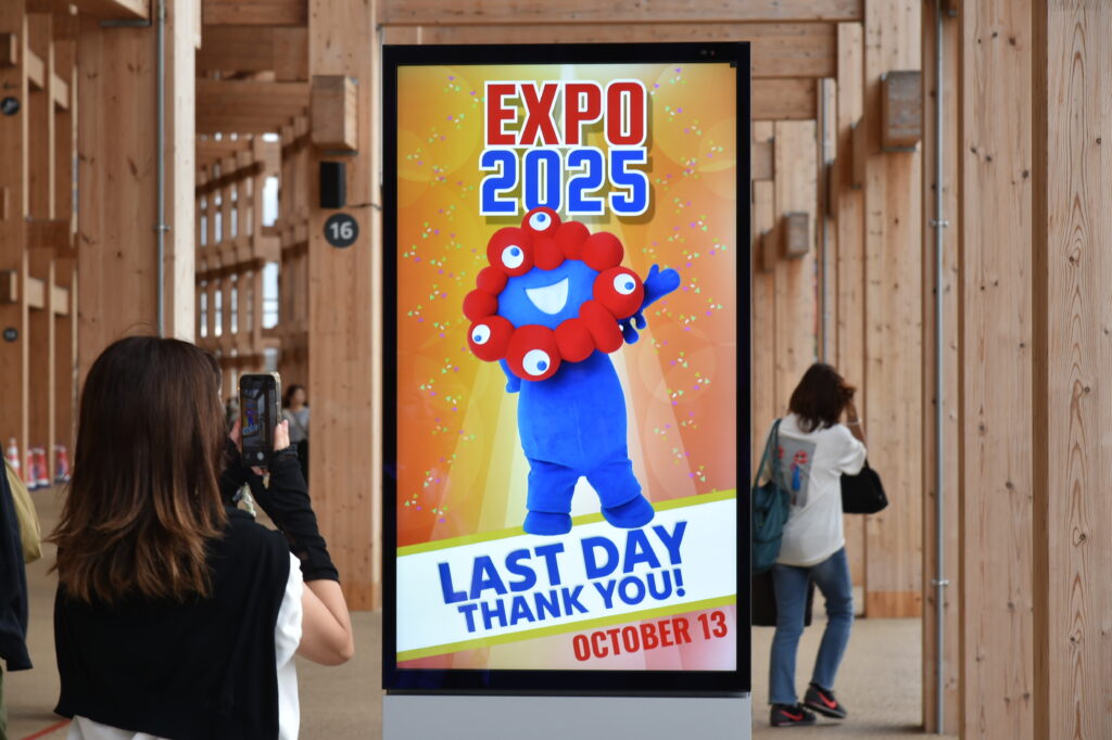 「大阪・関西万博」 大屋根リング下の電光掲示にはミャクミャクと最終日の「LAST DAY THANK YOU!」の表示が出ていた=13日午前8時54分、大阪市此花区の夢洲(竹川禎一郎撮影)