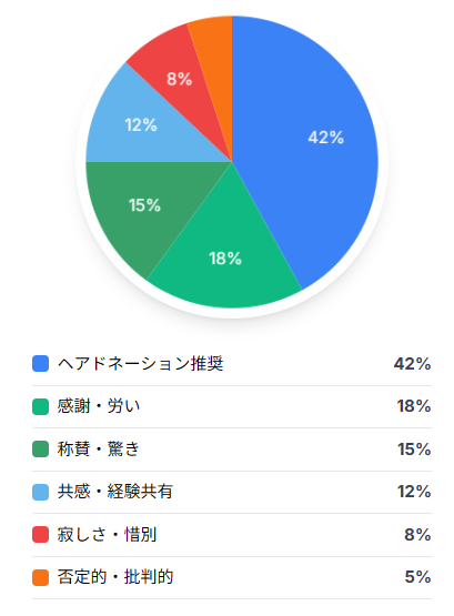 今回の分析では、落合さんが5.5年間願掛けで伸ばしていた髪を切ることについて、おおむねポジティブな反応がみられました。なかでも、ヘアドネーションの推奨が最も多いコメントで、綺麗な髪を病気の子どもたちのためのウィッグ作成に寄付することを勧めていました。また、 万博でのnull2パビリオン運営に対する感謝や労いの言葉や、自身もヘアドネーションをした経験や、同様に願掛けで髪を伸ばしている体験の共有などの、親しみの声も多くみられました。