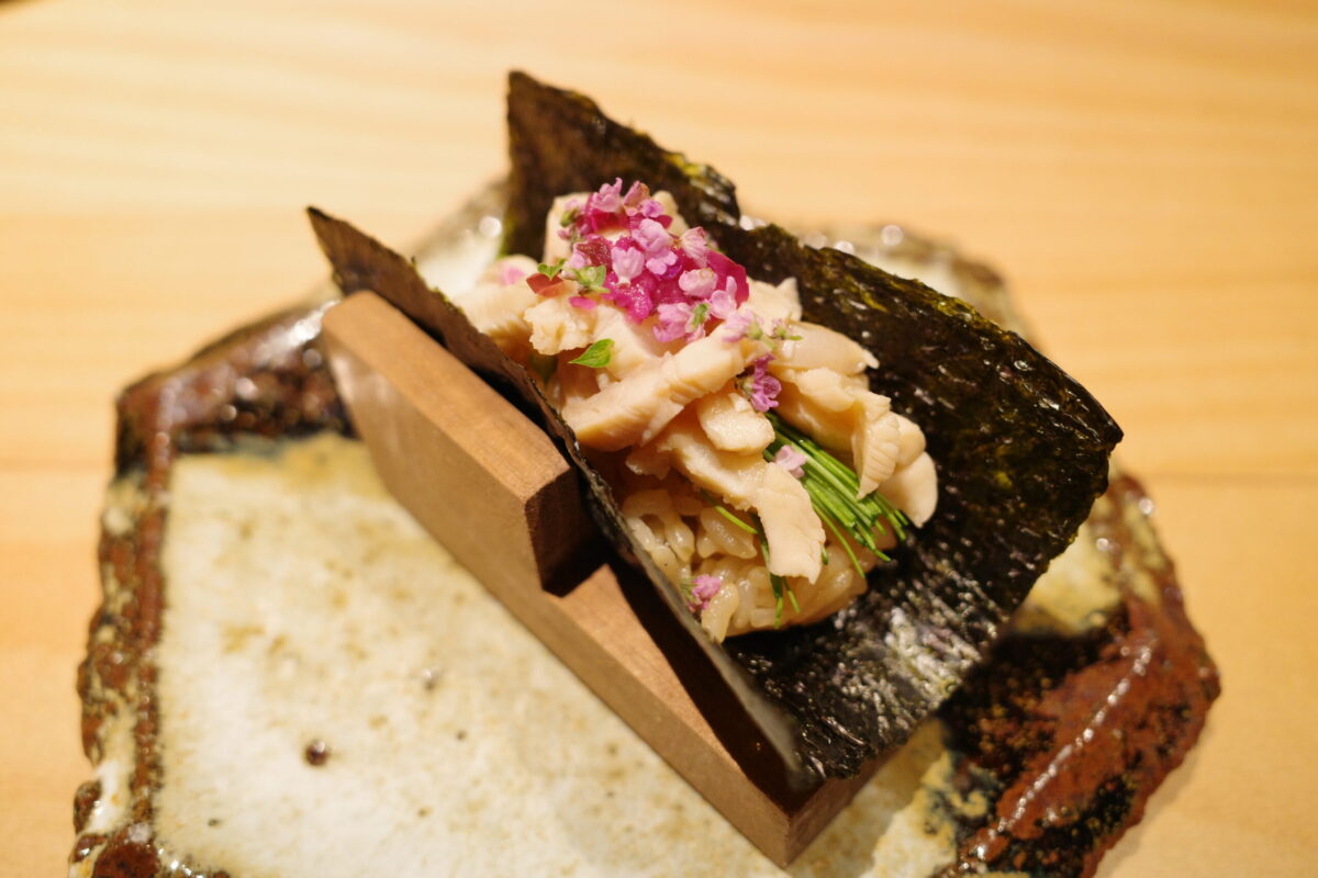 ここでしか食べられない名物「ふぐの手巻き寿司」。海苔の磯の香り、しば漬けの食感・塩気が絶妙なバランス。ふぐの淡白な旨みをぐっと引き立ててくれます。