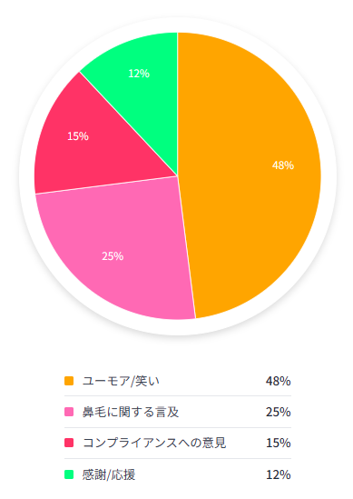今回の分析では、津田さんの「スチュワーデスびんびん物語」というフレーズをおもしろがる反応や、動画中に津田さんが鼻毛を抜く行為に対する言及が多いことが分かりました。全体的には動画の内容を楽しんでいるコメントが多く見られたのですが、一部では現代のコンプライアンスの厳しさに対する批判的な意見もありました。