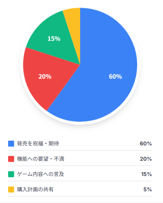 今回の分析では、ポケモンZAの発売を祝福する声のほか、期待を表明する声が多数を占める一方、「おまかせレポート」(オートセーブ)機能をオフにできないことに対する不満やオン・オフ切り替えの要望が複数見られました。昼と夜の2つの顔を持つミアレシティの探索や御三家選びなどゲーム内容への言及も見られ、ユーザーの期待の高さが伺えました。