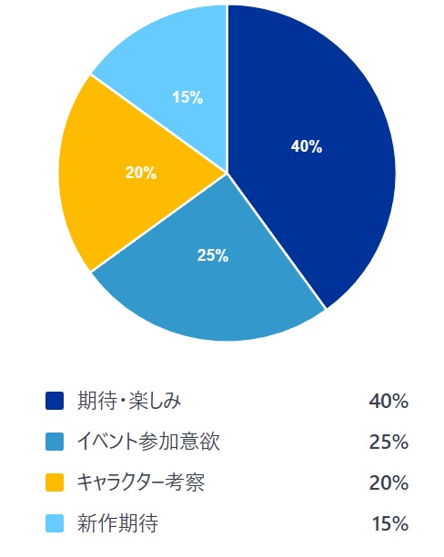 今回の分析では、ドラゴンボールの40周年記念イベント「ゲンキダマツリ」の開催発表に対し、多くのファンから期待や興奮のコメントが多く寄せられています。野沢さんのトークステージや新作アニメ・映画の発表を期待する声、応募したことを報告するコメントもありました。また、特定のキャラクター表現(悟空の衣装や形態など)についての議論も見られましたが、全体的には肯定的な反応が中心でした。