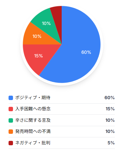 今回の分析では、HIKAKINさんが自身監修のみそ味のカップラーメン「みそきん」の新商品「辛みそきん」を25日と31日に発売することを発表したことに対し、多くの人が期待や興味を示しており、「食べてみたい」「楽しみ」といった好意的なコメントが目立ちます。一方で、「どうせ買えない」「また争奪戦になる」などの入手困難を予想する声のほか、辛い商品であることから「辛いもの好き」として喜ぶ声と「辛いのは苦手」と敬遠する人に反応が分かれていました。