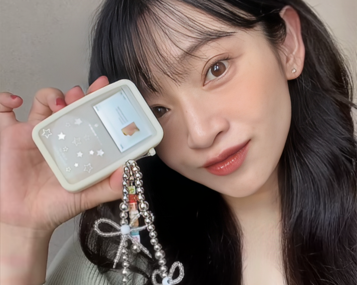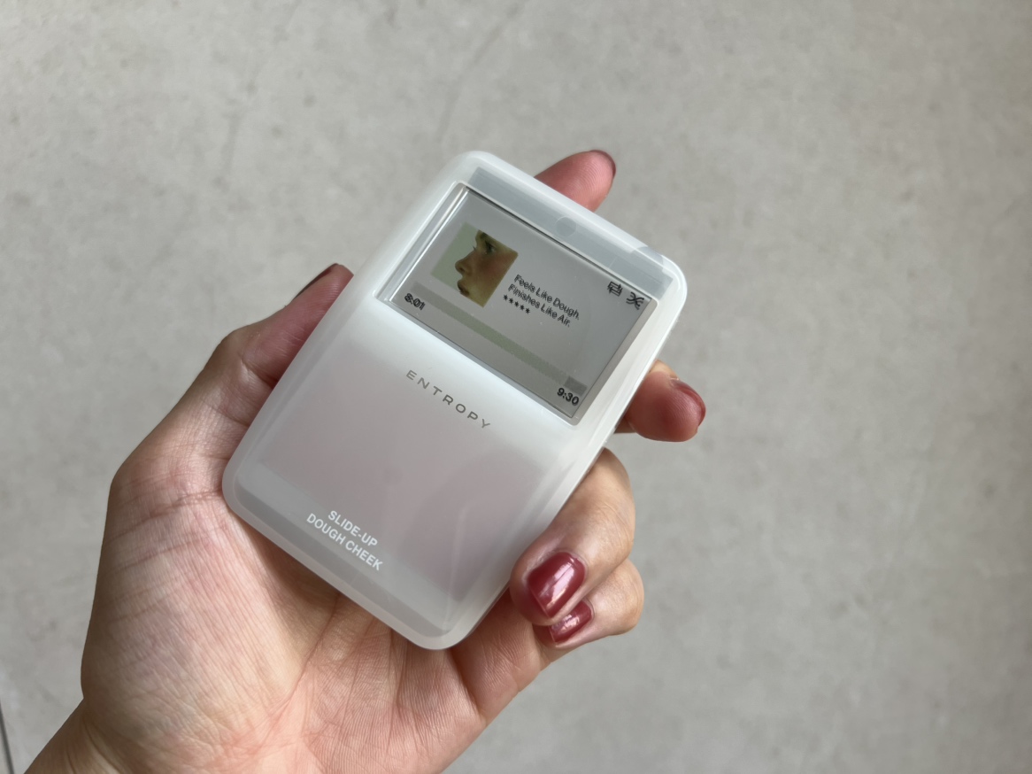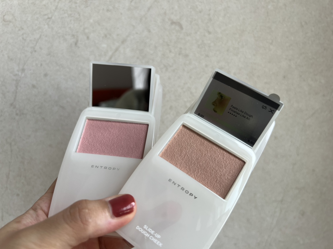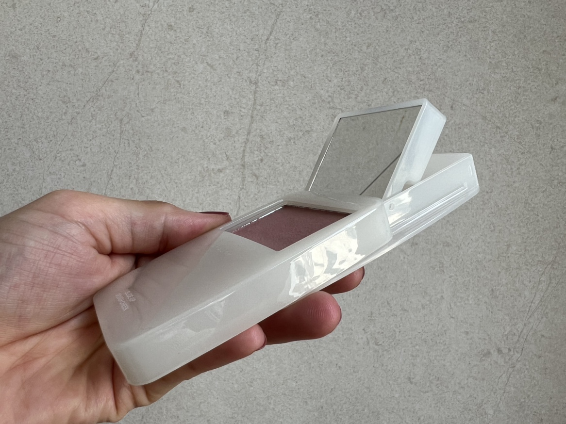 ipodのような見た目をスライドさせると現れるキュートなチークで、背面にはパフまで付いていてとても便利。最初は秋らしいベージュだけにするつもりが、ピンクがポップアップ限定の人気色だと聞き、結局2色とも購入して大満足でした。