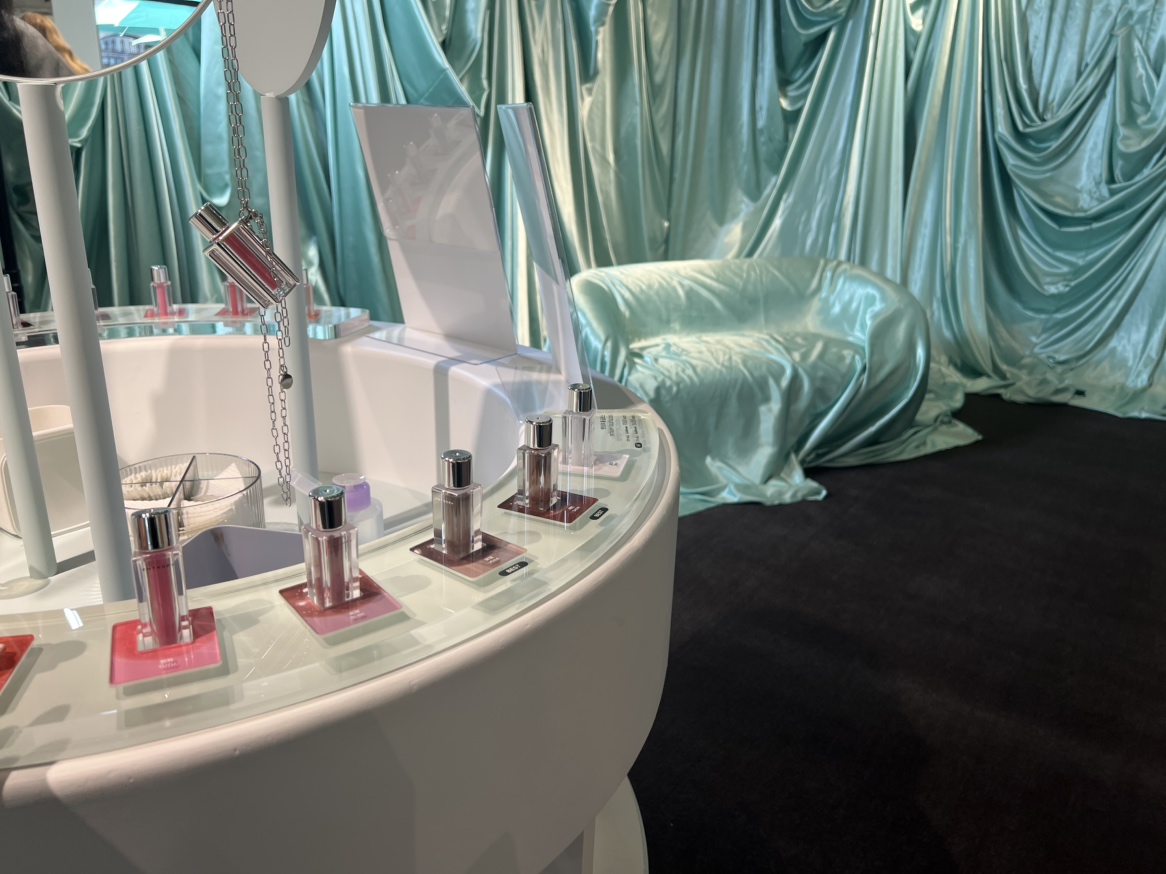 店内に入ると、まず目を引くのは洗練された空間デザイン。オフエメラルドを基調にしたインテリアにコスメがアートのように並べられ、照明の当たり方やディスプレイからもブランドの世界観が伝わってきます。