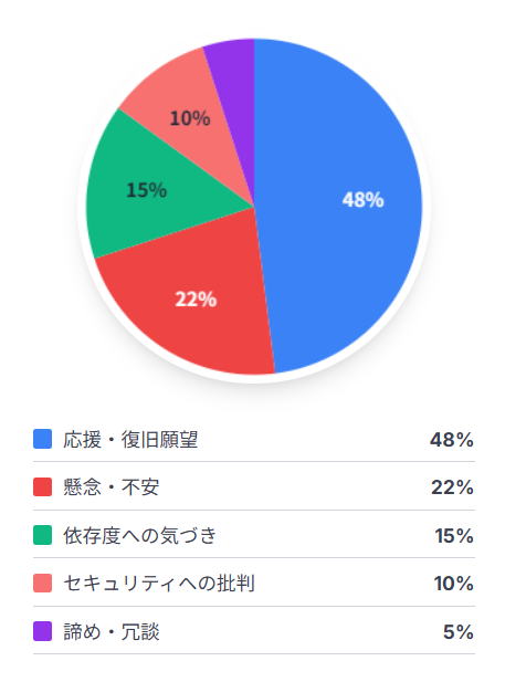 今回の分析では、システム復旧を願う「頑張れアスクル」といった応援や激励の声が多数を占めていた一方で、同時に業務のシステムへの依存度の高さを再認識したという声、ランサムウェア攻撃の増加、個人情報漏洩へのセキュリティ懸念を心配する声もありました。また、他社での類似事例への言及も見られ、もはやサイバー攻撃が対岸の火事ではないという危機感が強く表れていました。
