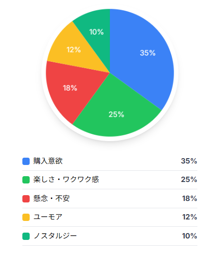 今回の分析では、明治が「チョコベビー」の60周年記念として「メガチョコベビーバケツ」を発売することに対し、多くのコメントが商品コンセプトに大きな興奮と期待を示しています。特に、「買いたい」「欲しい」といった購入意欲を示す反応が目立ちます。一方で、「食べきれない」「溶けてしまう」「高すぎる」などの懸念に加え、カロリー摂取による健康面への心配を示すコメントもあります。そして、ユーモアを交えたコメントも多く、「牛乳に入れて飲みたい」「1粒ずつ食べると4年かかる」「スコップで食べたい」などの楽しい使用方法を提案するものも見られるなど、期待の高さがうかがえました。