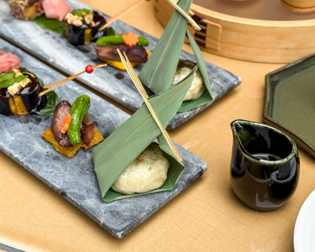 椎茸で栗のようなビジュアルに作られているのは手毬寿司。