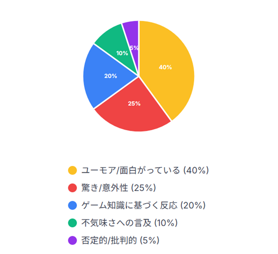 今回の分析では、バイオハザード公式アカウントのパロディ投稿に対し、SNSでは公式が可愛らしいペット写真をベイカー家に見立てた投稿内容に驚きつつも、「おもろい」「公式ノリすぎ」といったユーモアを楽しむ声が多く見られました。ゲーム内のキャラクターや要素に基づいた冗談コメントのほか、不気味さを指摘する声も見られましたが、全体としては公式が意外な形で参加したことを面白がる前向きな反応が中心でした。