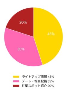 「ライトアップも相まって圧巻」「広い園内で秋を感じたい」などの感想に加え、「写真撮影会」「ロケ撮影」「秋コーデ」など、フォトジェニックな体験を目的とする投稿も目立ちました。