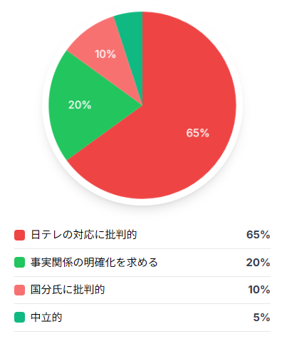 今回の分析では、元TOKIOの国分さんが日弁連に人権救済を申し立てたことについて、日テレの福田社長が27日の会見で「大変戸惑っている。現状のままでは対話に応じるのは難しい」との認識を示したことに対し、日テレの対応に批判的な意見が多く見られた一方、ハラスメント被害者保護の観点から日テレの対応を支持する声もありました。国分氏が自身の行動を反省すべきという意見もありましたが、全体として、詳細が不透明なまま芸能活動を制限されている状況に対する不公平感を述べる声が多く寄せられていました。