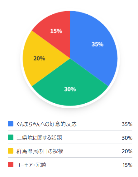 今回の分析では、ぐんまちゃんの可愛さへの称賛の声のほか、群馬県民の日を祝う声などが多く見られました。とりわけ群馬、埼玉、栃木の三県境に関する言及や冗談などで盛り上がりを見せていました。また動画のぐんまちゃんの様子から「群馬から出られない」というユーモアのある声も多く寄せられていました。