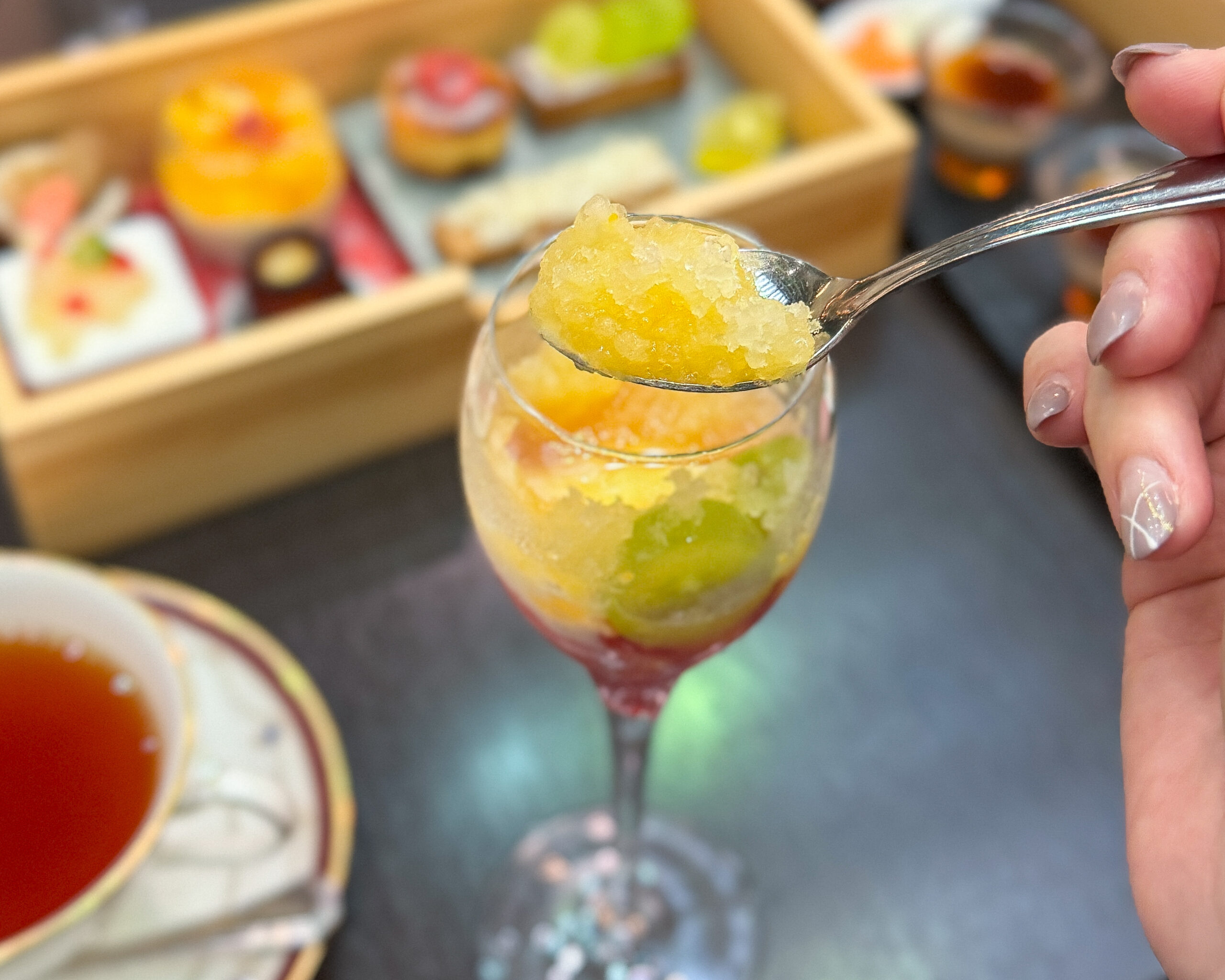 〆パフェは、丹後ジャージー牛乳アイスやシャインマスカット、贅沢にヴーヴ・クリコのグラニテが入り、さっぱりとした味わいでした。