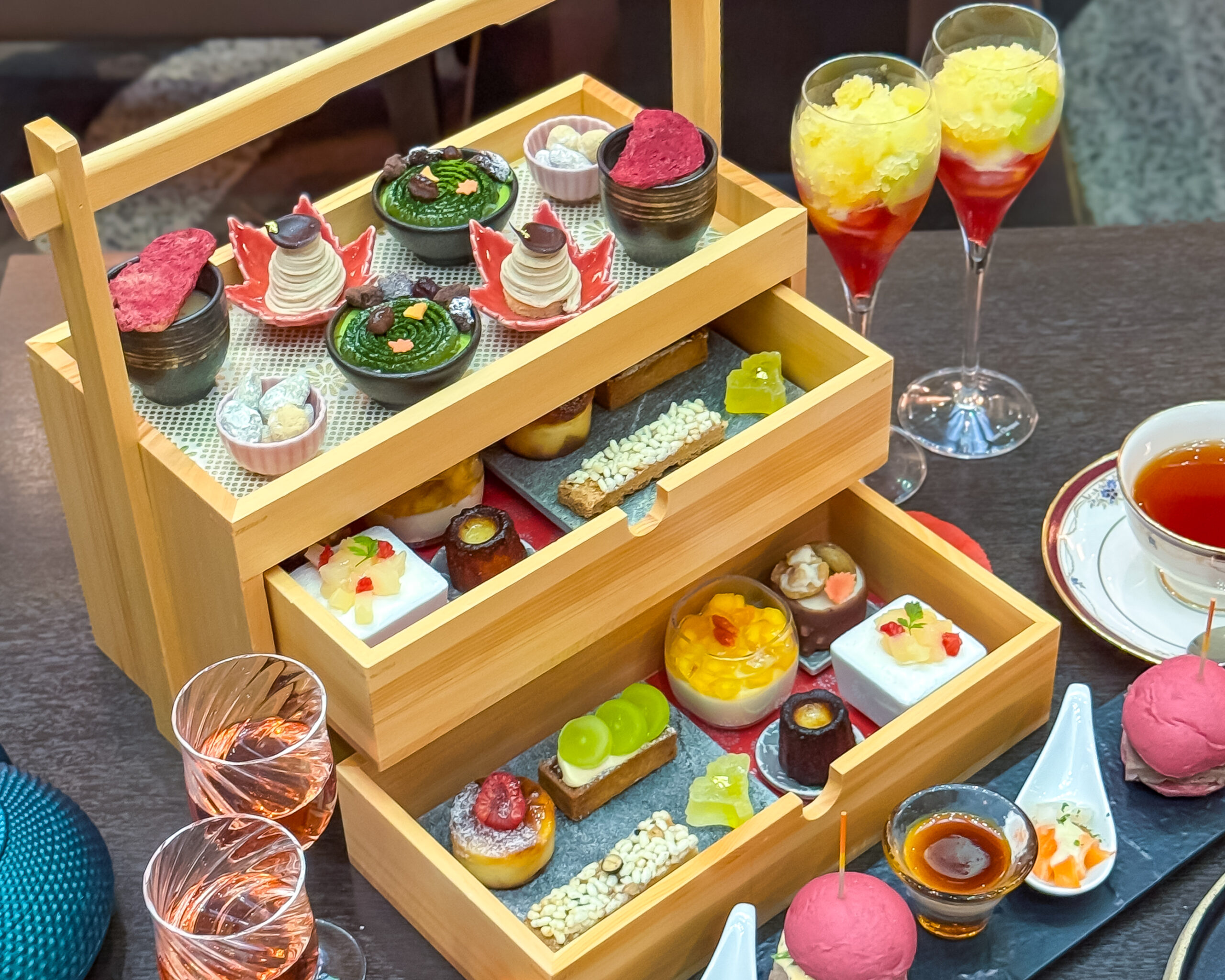 ロビーの中央に位置するラウンジ・バー「クー・オ・ミディ」では、手提げ付きの木箱に盛り付けられたアフタヌーンティーが開催されています。