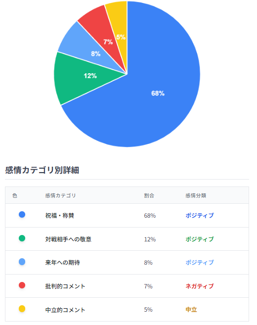 今回の分析では、ソフトバンクが阪神を破り日本一に輝いたことに対し、コメントの大部分はソフトバンクの日本一を祝う声や称賛の言葉で「おめでとう」「ありがとう」といった言葉が頻出しています。とりわけ5年ぶり12度目の日本一を称える声、春先の不調から立ち直った軌跡を称える声にあふれていました。