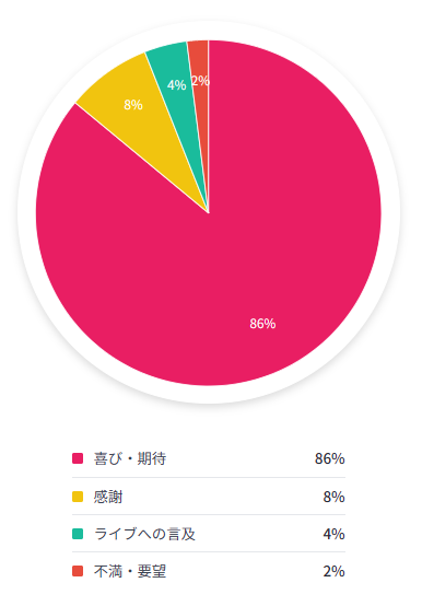 今回の分析では、新曲の先行配信に対する喜びと感謝の気持ちを表すコメントが大多数を占めていることが分かりました。「待ち侘びていました」「早く聴きたい」といったコメントのほか、ライブに向けて予習したいというコメントが多数見られます。また、ライブチケットについての心配や北海道公演がないことを残念がるコメントも少数ありました。