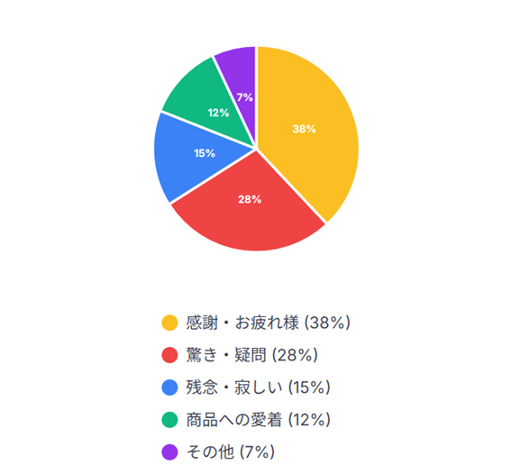 今回の分析では、「サッポロポテト」の公式アカウントの終了告知に対し、多くのユーザーが「お疲れ様でした」「ありがとうございました」といった感謝や別れの言葉を述べています。一部のユーザーは突然の終了に驚きや残念な気持ちを表明しており、「え?」「なぜ?」といった疑問の声も見られます。また、「今日初めて知った」という声も多く、このアカウントの存在を終了告知で初めて知ったというユーザーも少なくありません。商品自体が終了するのではなく、アカウントの終了であることを確認する質問もありました。