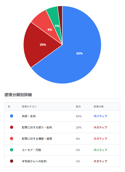 今回の分析では、宇多田さんが日本で相次ぐクマ被害と自身の過去の発言を絡めた一部週刊誌の報道に怒りをにじませた投稿に対し、多くの共感や支持のコメントが寄せられています。大多数のコメントは宇多田さんに同情的で、週刊誌の報道手法に対する怒りや不信感を表明していました。