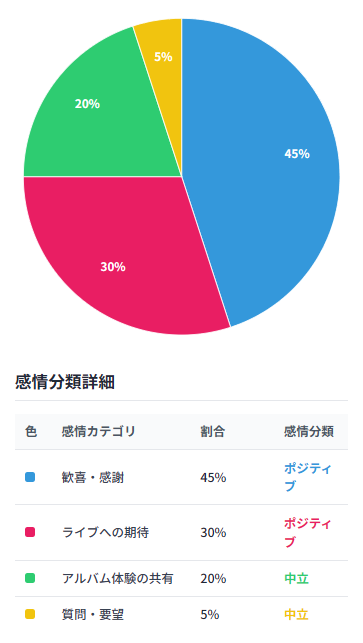 今回の分析では、多くのファンがアルバムの発売を喜び、曲の素晴らしさを称賛していることが分かりました。また、間もなく始まるドームツアーへの期待と興奮を表明するコメントも多く見られます。全体として、B’zの長年のキャリアと現在も進化し続けるサウンドを高く評価するコメントであふれています。