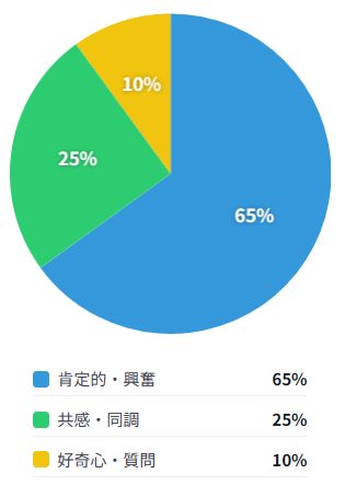 今回の分析では、コメントの65%が肯定的かつ興奮した反応を示しており、アイデアの創造性や面白さを絶賛しています。このほか、25%が共感や同調を示すコメントで、自分も同じことをしたい、または参加したいという願望を表しています。残りの10%は質問や好奇心を示すコメントで、詳細を知りたいという欲求を表しています。全体的に非常にポジティブな反応であることがわかります。