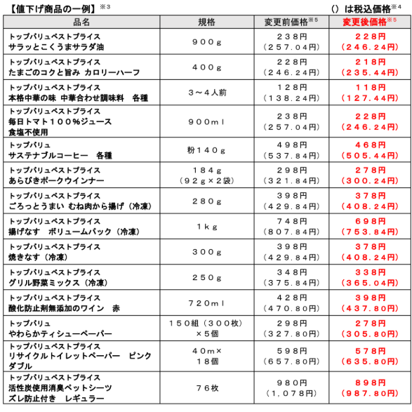 値下げするのは、冷凍食品や調味料、サラダ油、ティシューペーパーなどのほか、コーヒー、ワインなど。