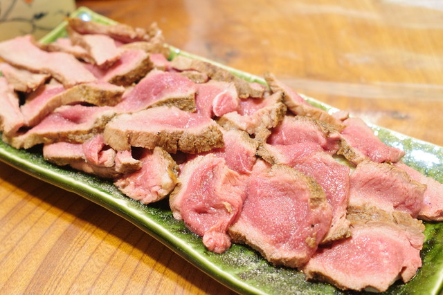 ほんのりピンク色のお肉が美しく並ぶ仔牛のローストビーフ。ひと口食べると、柔らかくて上品な弾力。赤身の旨味がじんわり広がって、噛むほどに甘みを感じます。脂っこさがなく、ヘルシーなのに満足感たっぷり。