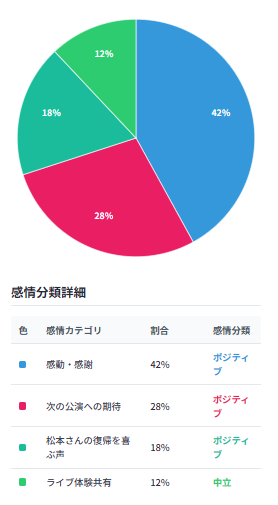 今回の分析では、多くのファンが「最高の時間」「世界一しあわせな時間」といった言葉で公演のすばらしさを伝えていることが分かりました。特に松本さんの復帰を喜ぶ「おかえりなさい」「安心しました」といったコメントも多数寄せられています。また、「福岡で待ってます」「東京ドーム楽しみ」といった次の公演への期待の声も多く見られます。