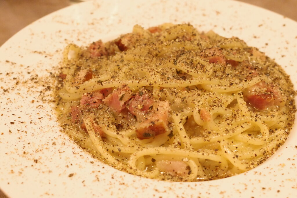 黒胡椒が山盛りでかけられ、具材はベーコンというシンプルさ。