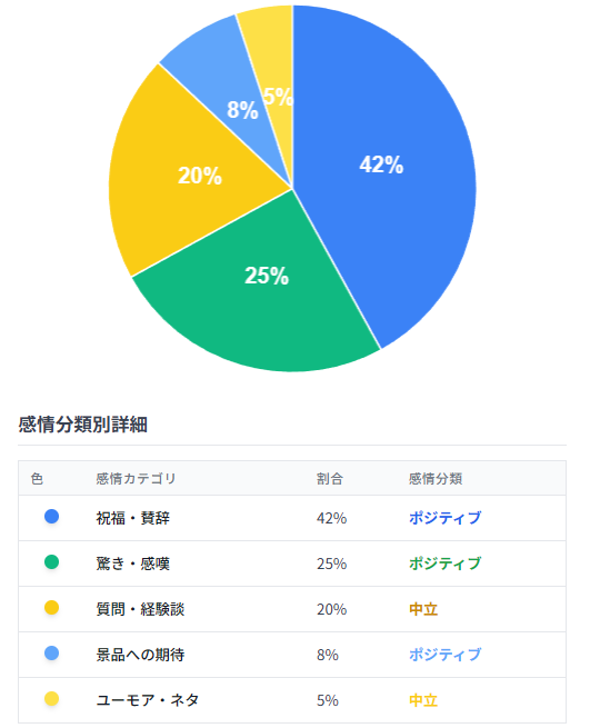 この投稿には、多くの反応が寄せられました。最も多かったのは投稿者への祝福の声で、全体の4割以上を占めています。
