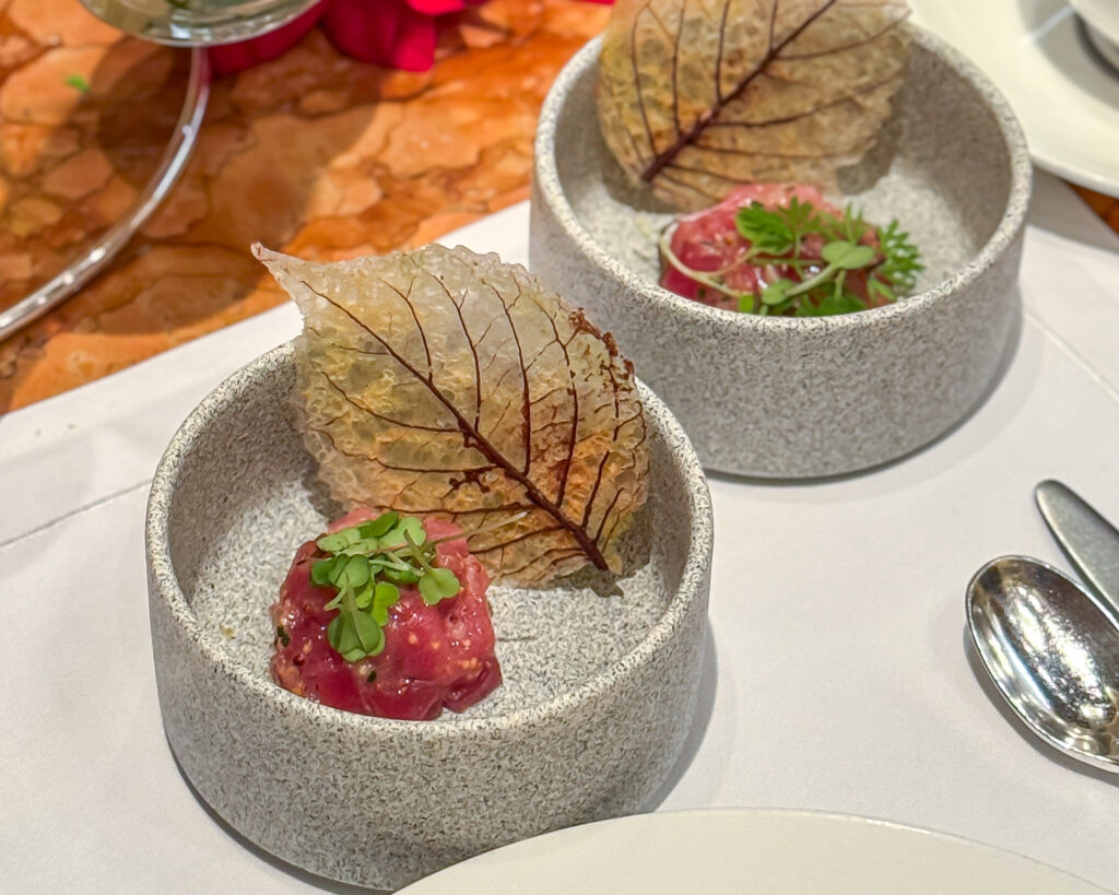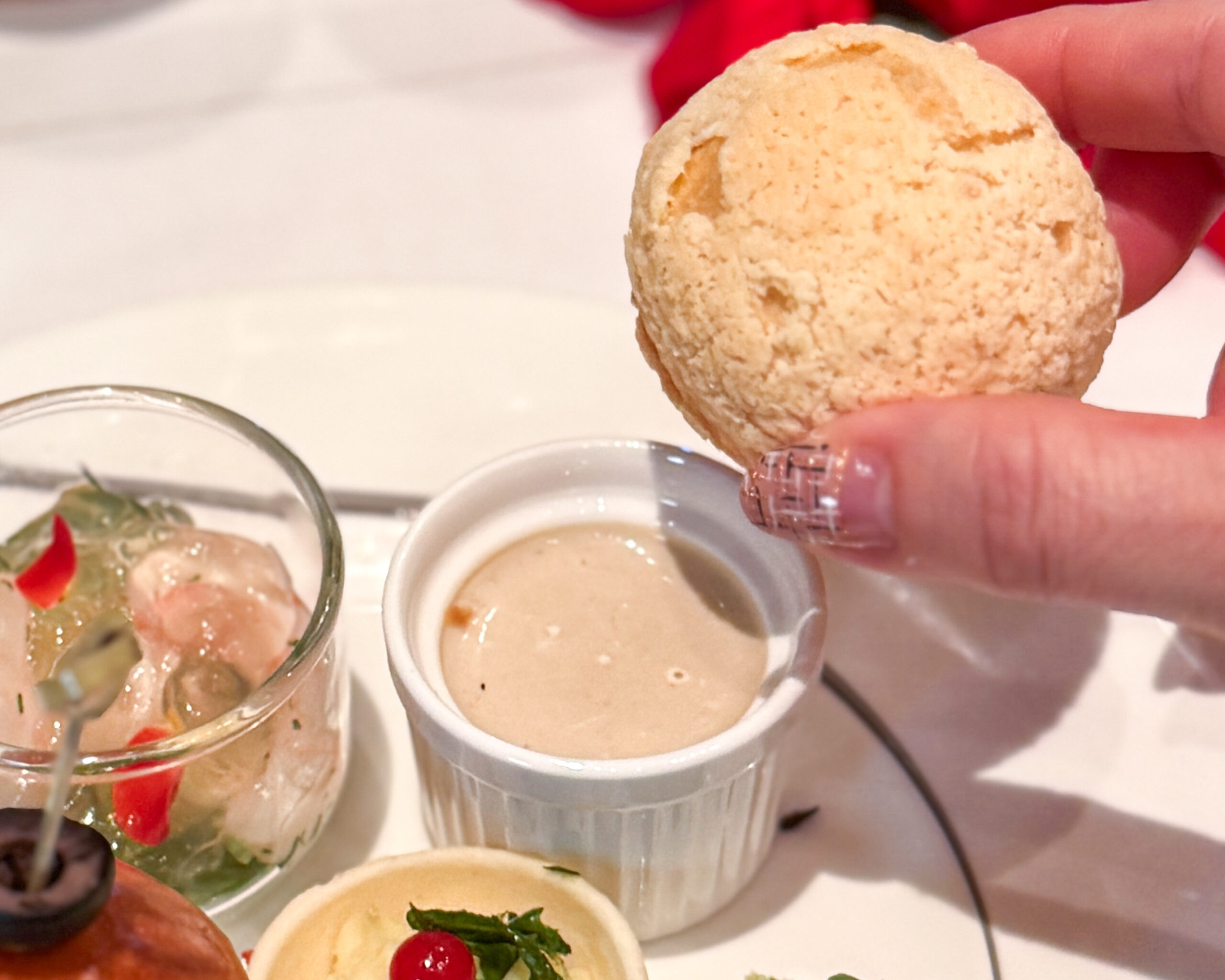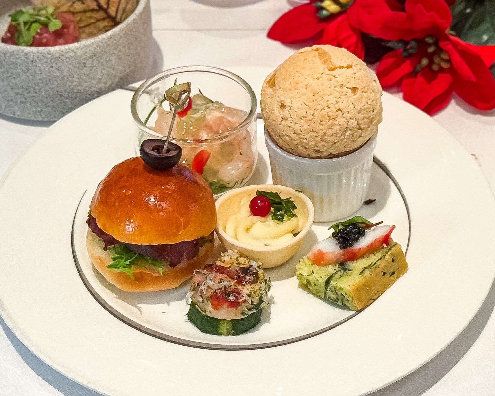 セイボリーではフォアグラとローストビーフを重ねた「ロッシーニバーガー」、クリーミーなベシャメルソース入りのシューが乗っているのはポルチーニ茸を用いた滋味あふれるポタージュ「ヴルーテ」、甘海老やキャビア、トリュフなどの高級食材を使用したお料理に心躍ります。