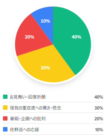 今回の分析では、佐野さんのモンスターボックス挑戦での大怪我に対して早期回復を願うメッセージが多数寄せられ、全治約8∼9か月のケガの重症度に驚きと心配の声が集中していた一方で、「またTBSか」と番組での危険な企画っや安全管理への批判の声もありました。また、佐野さんの今後の活動への影響を懸念する声も多く見られました。
