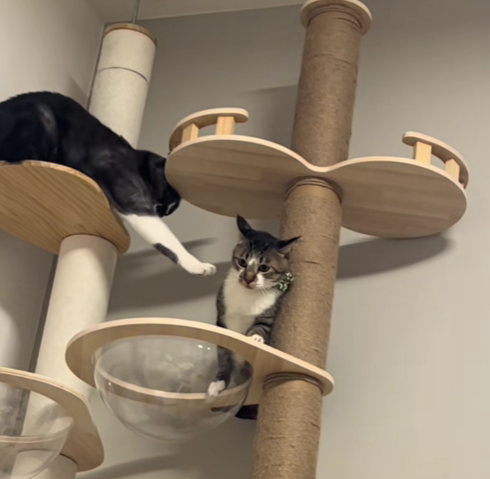 キャットタワーにのぼるmm(@miiiichann)さんのお宅の2匹のねこちゃん。