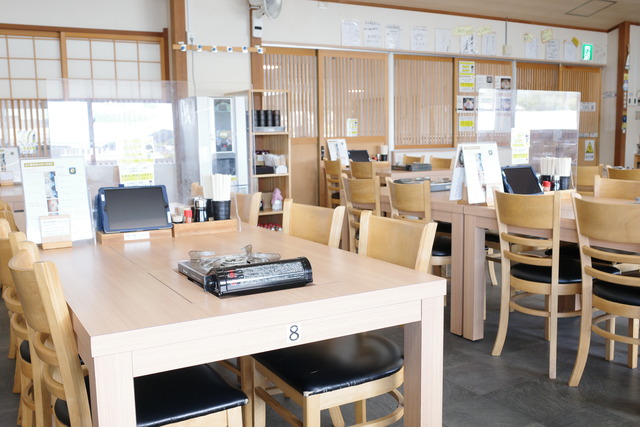 店内は広々とした4名掛けテーブルの並ぶ食堂スタイル。大きな窓から見える漁港の景色も眺めることができます。
